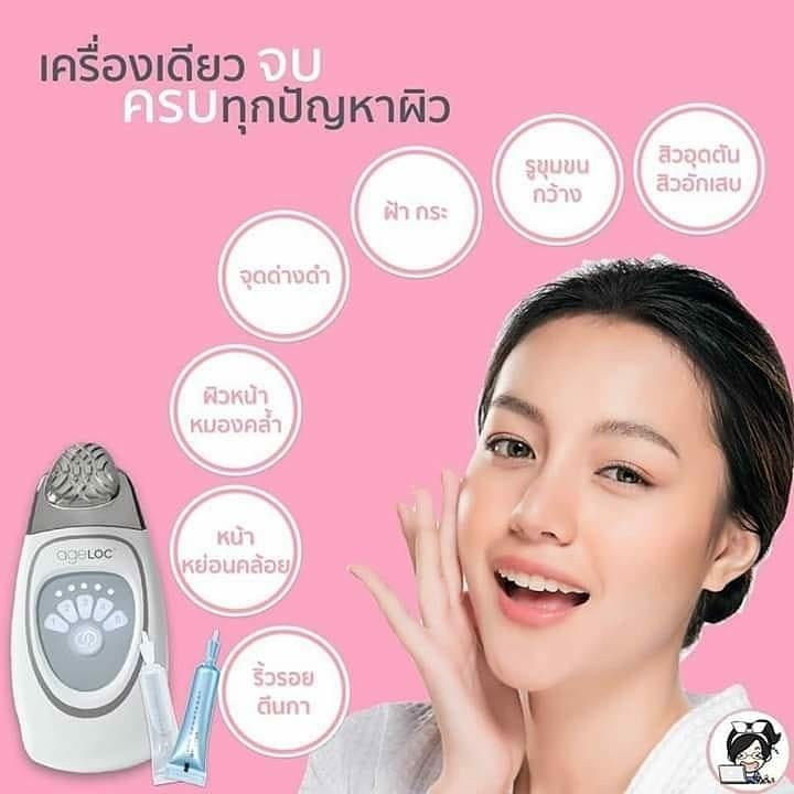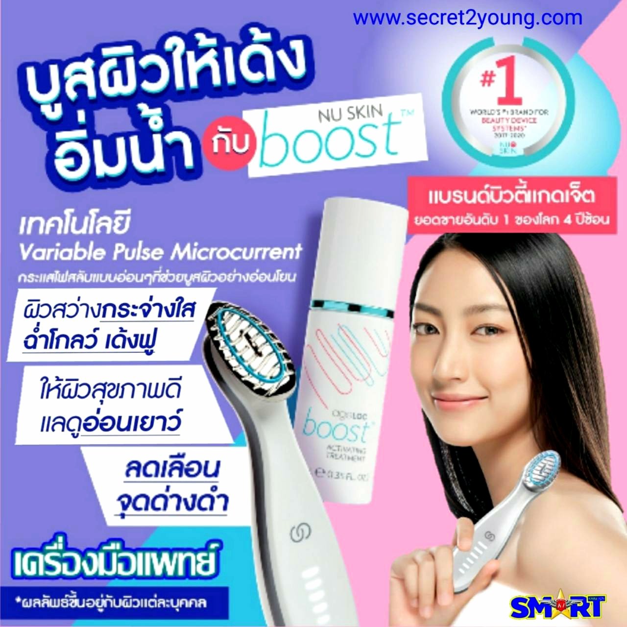 เครื่องผลักเซรั่มบำรุงผิว ของดีมีแล้วYOUNG !!Nu Skin ageLOC Boost (นู สกิน เอจล็อค บูสท์) เครื่องลดฝ้ากระจุดด่างดำ Nu Skin ageLOC Boost (นู สกิน เอจล็อค บูสท์) มาพร้อมนวัตกรรมใหม่ของเทคโนโลยี Variable Pulse Microcurrent ส่งผ่านกระแสไฟอ่อนๆ ในรูปแบบคลื่นไปยังผิวหนัง โดยสลับประจุ + และ - ในทุกๆ 2.4 วินาที สามารถกระตุ้นกล้ามเนื้อของผิวเพื่อคืนความอ่อนเยาว์ให้กับผิว ด้วยทรีทเมนท์สูตรพิเศษที่ออกแบบมาใช้ร่วมกัน ageLOC Boost Activating Treatment ทำหน้าที่เป็นตัวกลางในการส่งกระแส V-Pulse ไปยังผิว ด้วยสารสำคัญในการบำรุงผิวเพื่อความงามแบบสุดพิเศษ :