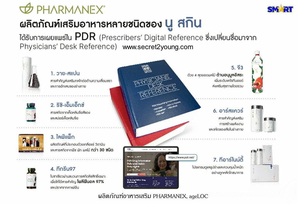 คู่มือนี้ได้รับความเชื่อถือมาอย่างยาวนาน จากผู้เชี่ยวชาญในวงการแพทย์ทั่วโลก คู่มือ PDR เล่มนี้ ถือเป็นแหล่งอ้างอิงของรายการยาเพื่อบำรุงสุขภาพ ฟาร์มาเน็กซ์ (Pharmanex) ภายใต้การจัดจำหน่ายโดยบริษัท นู สกิน (Nu Skin) มีผลิตภัณฑ์ที่ได้รับเกียรติให้บันทึกอยู่ใน PDR ดังนี้