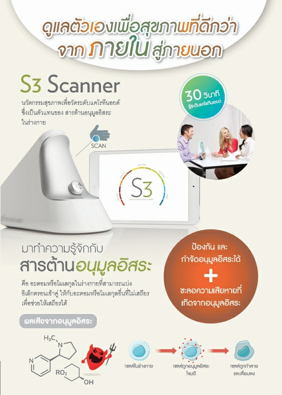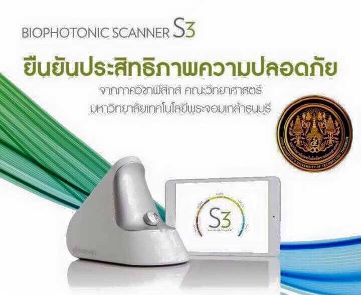 ไม่ต้องเจาะเลือดแล้วรอผลเป็นอาทิตย์ แต่สามารถทราบผลของระดับแคโรทีนอยด์ (Carotenoids) (หนึ่งในสารต้านอนุมูลอิสระที่สำคัญ) ได้ด้วยเครื่องไบโอโฟโตนิค สแกนเนอร์ เอส 3 (Biophotonic Scanner S3) นวัตกรรมเพื่อสุขภาพที่ลงทุนวิจัยกว่า 3,000 ล้านบาท ลิขสิทธิ์เฉพาะของ นู สกิน เพียงวางฝ่ามือแล้วรอผลใน 30 วินาที ก็ช่วยให้เราทราบถึงความแข็งแรงของกำแพงสุขภาพตัวเอง!