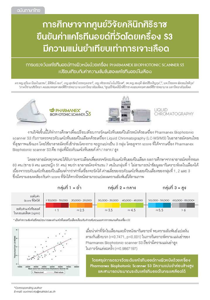 การศึกษาจากศูนย์วิจัยคลินิกศิริราช ยืนยันค่าแคโรทีนอยด์ที่วัดโดยเครื่องสแกน Biophotonic Scanner S3 มีความแม่นยำเทียบเท่าการเจาะเลือด และภาควิชาฟิสิกส์ คณะวิทยาศาสตร์ มหาวิทยาลัยเทคโนโลยีพระจอมเกล้าธนบุรี ยืนยันประสิทธิภาพความปลอดภัย
