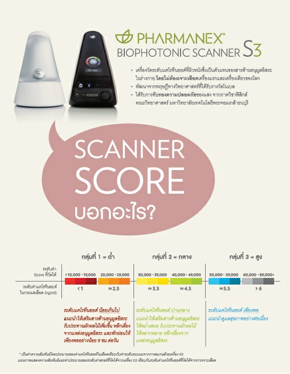 วัดระดับค่าสารต้านอนุมูลอสระในผิวของคุณ Skin Carotenoid Score ด้วยเครื่องสแกน รับประทาน LifePak หรือ G3 เป็นเวลา 90 วัน แล้ววัดคะแนนอีกครั้ง คุณจะได้รับหลักฐานว่าอาหารเสริม Pharmanex สามารถเพิ่มระดับสารต้านอนุมูลอิสระและสุขภาพโดยรวมของสารต้านอนุมูลอิสระของคุณได้ ในความเป็นจริง Pharmanex รับประกันว่าคะแนนผิวของคุณจะเพิ่มขึ้นเมื่อคุณรับประทาน LifePak หรือ G3 เป็นประจำตามคำแนะนำ