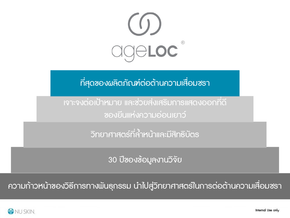 นู สกิน เข้าใจความกังวลของผู้คนเรื่องความเสื่อมชรา จึงทุ่มเทการวิจัยมุ่งเป้าไปที่ต้นกำเนิดของความเสื่อมชรา จนค้นพบว่าการแสดงออกของยีนบางกลุ่มที่เป็นต้นเหตุของความเสื่อมชรา จึงพัฒนาจนเกิดเป็น เทคโนโลยีเอจล็อค (ageLOC) และต่อยอดเป็นผลิตภัณฑ์นวัตกรรมหลากหลาย ที่เน้นเรื่องความเยาว์วัยและชะลอความเสื่อมชราของร่างกาย