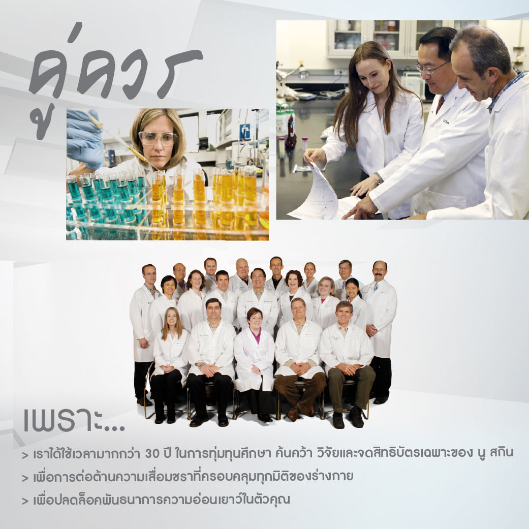 เป็นความก้าวหน้าทางการวิจัยทางวิทยาศาสตร์ NU SKIN ร่วมมือกับนักวิทยาศาสตร์ที่โดดเด่นจากทั่วโลกและลงทุนหลายล้านดอลลาร์ในการวิจัยด้านการต่อต้านวัยและพันธุกรรมเป็นเวลาหลายปี เพื่อให้ตลาดมีสูตรการวิจัยทางวิทยาศาสตร์ที่มองไปข้างหน้า และผลิตภัณฑ์ต่อต้านวัยที่ดีเยี่ยม ด้วยการวิจัยในระดับการแสดงออกของยีน เราสามารถเข้าใจกระบวนการชราได้ดีขึ้น และค้นหาวิธีแก้ปัญหาเพื่อชะลอการแก่จากระดับการแสดงออกของยีน