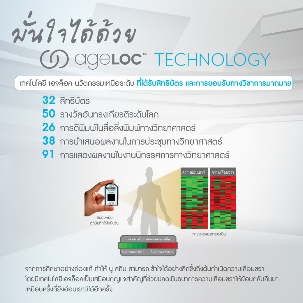 ด้วยเทคโนโลยี ageLOC นู สกิน ได้ค้นพบรูปแบบการแสดงออกของยีนที่เกี่ยวข้องกับผิวหนัง ร่างกาย และพลังงาน พร้อมทั้งคัดกรองและพัฒนาสูตร ageLOC ที่ได้รับการขัดเกลาและผลิตภัณฑ์ ageLOC ที่ผ่านการทดสอบตามเวลา โดยฉีดพลังงานใหม่เข้าสู่ตัวเราอย่างต่อเนื่องจากภายในสู่ภายนอก และฟื้นฟูความอ่อนเยาว์ของเรา ความลับ พบกับตัวตนที่สวยงามยิ่งขึ้น