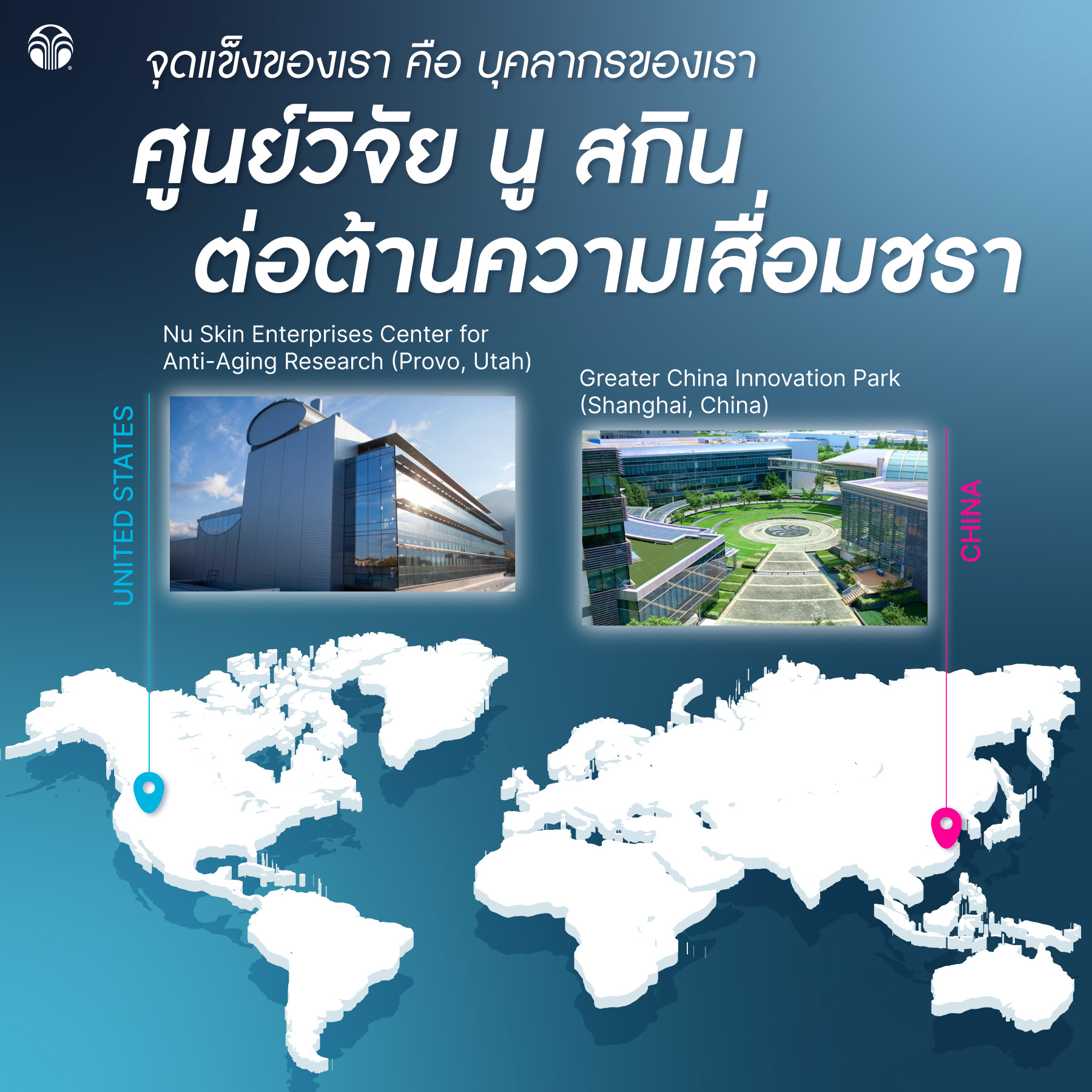 ศูนย์นวัตกรรมของ นู สกิน ซึ่งตั้งอยู่ในเมืองโพรโวและเซี่ยงไฮ้ เป็นตัวแทนของความมุ่งมั่นของเราในการนำเสนอโซลูชั่นด้านความงามและสุขภาพที่ครอบคลุมสำหรับอุตสาหกรรมการชะลอวัย นู สกิน ลงทุนมากกว่า 100 ล้านดอลลาร์ในศูนย์นวัตกรรมในโพรโว และเกือบ 500 ล้านหยวนในการสร้างอุทยานนวัตกรรม Greater China ในเซี่ยงไฮ้ ซึ่งทำให้เป็นหนึ่งในการลงทุนในต่างประเทศที่ใหญ่ที่สุดในประวัติศาสตร์ของ นู สกิน