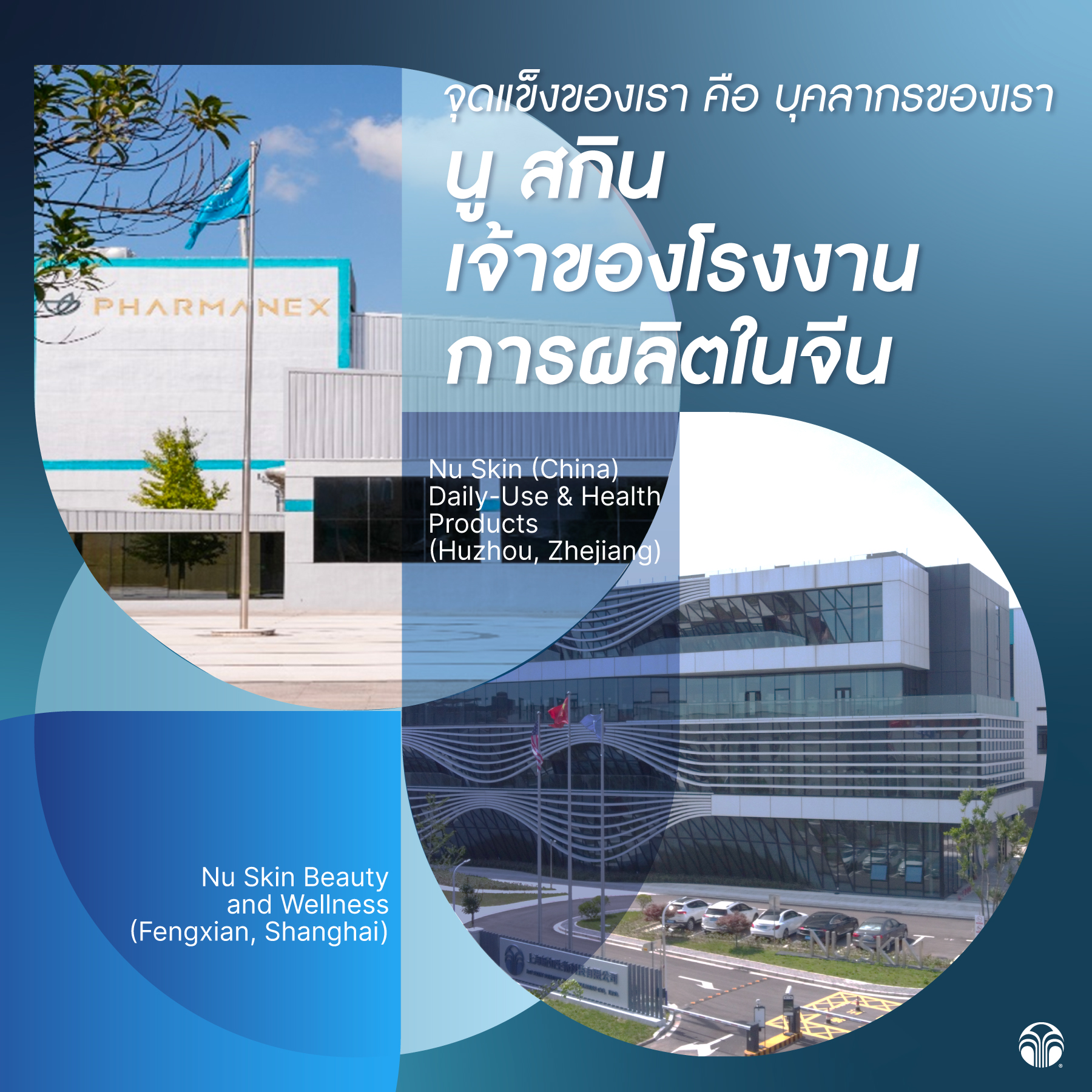 นอกเหนือจากศูนย์นวัตกรรมในเซี่ยงไฮ้แล้ว นู สกิน ยังมีโรงงานผลิตที่ทันสมัยอีก 2 แห่งในประเทศจีน โดยแห่งหนึ่งเชี่ยวชาญด้านผลิตภัณฑ์เสริมอาหาร อีกแห่งหนึ่งเน้นผลิตภัณฑ์ความงามและสุขภาพ โรงงานเหล่านี้ช่วยเพิ่มประสิทธิภาพในการผลิตและการจัดจำหน่ายในภูมิภาคเอเชียตะวันออกเฉียงใต้ พร้อมทั้งรักษามาตรฐานคุณภาพสูงสุดในทุกขั้นตอน โดยเฉพาะอย่างยิ่งในขั้นตอนการคัดเลือก ความปลอดภัย และการพิสูจน์ของกระบวนการคุณภาพ 6S Quality Process ของเรา