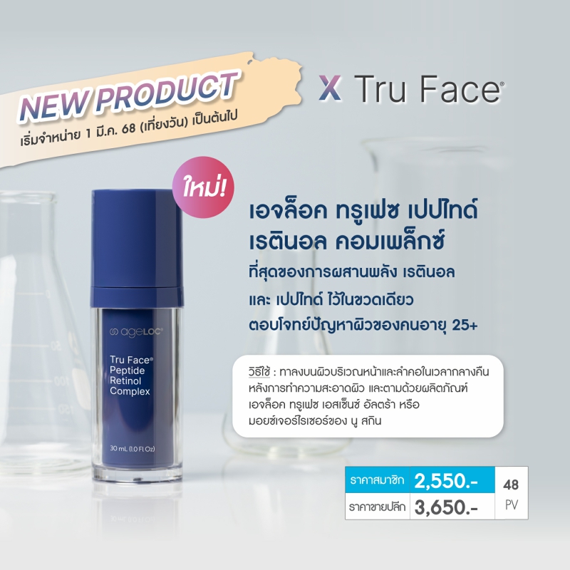 ที่สุดของการผสานพลังเรตินอลและเปปไทด์ ไว้ในขวดเดียว! เอจล็อค ทรูเฟซ เปปไทด์ เรตินอล คอมเพล็กซ์ (ageLOC Tru Face Peptide Retinol Complex) เป็นเรตินอลคอมเพล็กซ์ที่อ่อนโยน แต่ยังให้ประสิทธิภาพที่ครบถ้วน ด้วยสูตรผสมอันเป็นเอกลักษณ์ซึ่งประกอบด้วย เรตินอล คอมเพล็กซ์ [Retinol Complex) ที่ผสานพลังของเรตินอลที่เสถียรและเรติโนอิก เอซิด เอสเตอร์ (Retinoic Acid Ester) เทคโนโลยีเปปไทด์ ซึ่งเป็นเทคโนโลยีขั้นสูงค้นพบโดย AI ที่มีรูปแบบเดียวกับธรรมชาติและผ่านการพิสูจน์ทางคลินิกแล้วว่าสามารถแก้ปัญหาผิวที่ตรงจุด และช่วยเพิ่มประสิทธิภาพของเรตินอล ช่วยลดเลือนริ้วรอย ทำให้ผิวดูเรียบเนียนขึ้นเหมือนผิวกระจก ความหมองคล้ำและจุดด่างดำดูจางลง อีกทั้งยังเสริมความยืดหยุ่นของผิว นอกจากนี้ยังมีส่วนผสมของ โจโจบา+4TB เบลนด์ ช่วยปลอบประโลมผิว เพิ่มความชุ่มชื้นสู่ผิว และเอจล็อค เบลนด์ [ageLOC Blend] เทคโนโลยีเอกสิทธิ์เฉพาะของ นู สกิน [Nu Skin] ตรงเข้าจัดการปัญหาผิวอย่างตรงจุด เพื่อผิวสวยแลดูสุขภาพดี