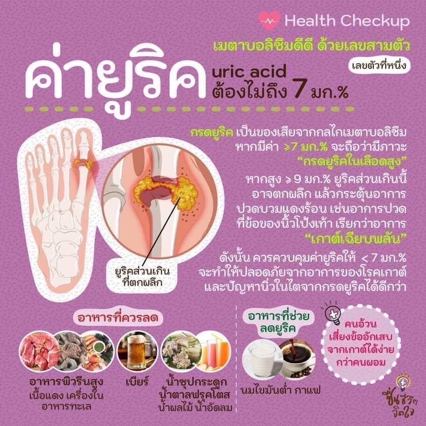 กรดยูริค เป็นของเสียจากกลไกเมตาบอลิซึม หากมีค่า ≥ 7 มก.% จะถือว่ามีภาวะ "กรดยูริคในเลือดสูง"