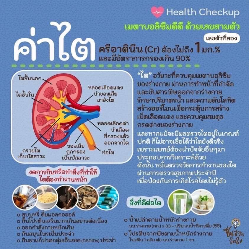 ค่าไต ครีอาตินีน (Cr) ต้องไม่ถึง 1 มก.% และมีอัตราการกรองเกิน 90%