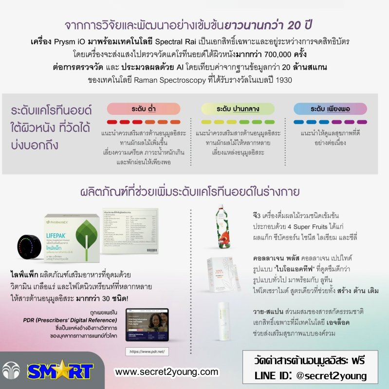 PRYSM iO เป็นอุปกรณ์ที่ใช้ วัดระดับสารต้านอนุมูลอิสระในร่างกาย โดยเฉพาะกลุ่ม คาโรทีนอยด์ (Carotenoids) ซึ่งเป็นสารต้านอนุมูลอิสระสำคัญจากผักและผลไม้