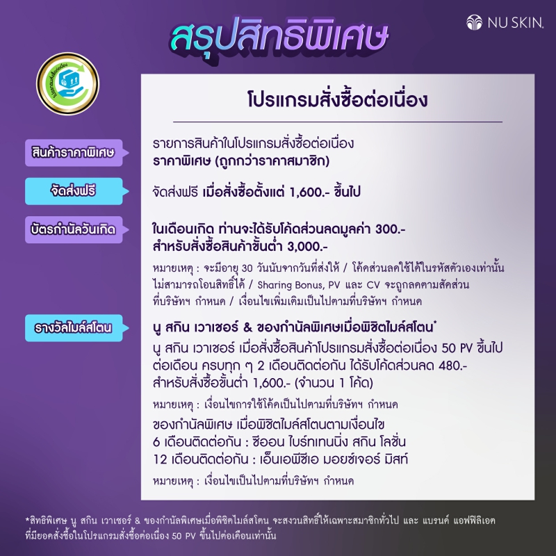 และสิทธิพิเศษสุดสำหรับสมาชิกที่อยู่ในโปรแกรมอย่างต่อเนื่อง รับของขวัญสุดเอ็กซ์คลูซีฟ เมื่อสั่งซื้อต่อเนื่องตามเงื่อนไข (6 เดือน/12 เดือน) และมียอดสั่งซื้ออย่างน้อย 50 PV ต่อเดือนในรหัสเดียวกัน