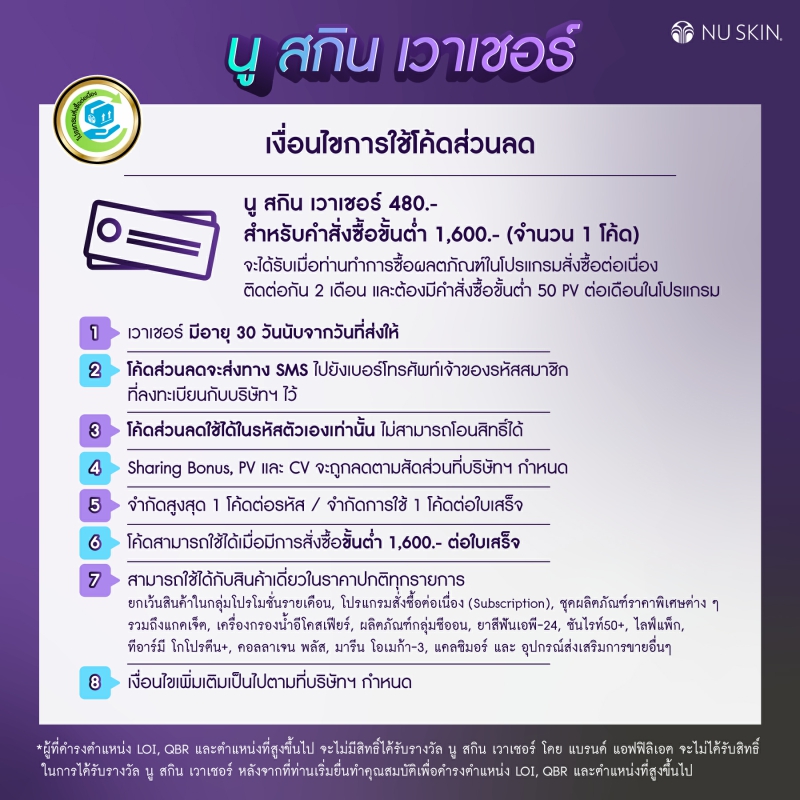 เงื่อนไขใช้โค้ดส่วนลด:โค้ดส่วนลด 480.- สำหรับคำสั่งซื้อขั้นต่ำ 1,600.-ผลิตภัณฑ์ที่สามารถใช้โค้ดส่วนลดได้ คือ สินค้าเดี่ยวในราคาปกติทุกรายการ และยกเว้น สินค้าในกลุ่มโปรโมชั่นรายเดือน,โปรแกรมสั่งชื่อต่อเนื่อง (Subscription), ชุดผลิตภัณฑ์ราคาพิเศษต่าง ๆ รวมถึงแกดเจ็ต, เครื่องกรองน้ำอีโคสเฟียร์,ผลิตภัณฑ์กลุ่มซีออน, ยาสีฟันเอพี-24, ซันไรท์50+, ไลฟ์แพ็ก, ทีอาร์มี โก โปรตีน+,คอลลาเจน พลัส, มารีน โอเมก้า-3,แคลซิมอร์ และอุปกรณ์ส่งเสริมการขาย /บริการต่าง ๆ• หลังหักส่วนลด คะแนน (PV), CV และแชริ่งโบนัส จะถูกลดตามสัดส่วนที่กำหนดในเงื่อนไขของบริษัทฯ• เงื่อนไขเพิ่มเติมเป็นไปตามที่บริษัทฯ กำหนด• ทางบริษัทฯ ขอสงวนสิทธิ์การเปลี่ยนแปลงโดยไม่ต้องแจ้งให้ทราบล่วงหน้า