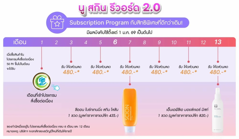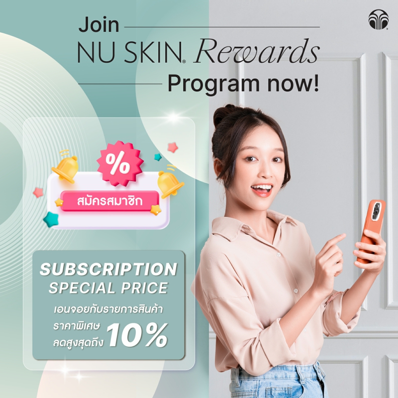 พบกับ นู สกิน รีวอร์ด 2.0 สิทธิประโยชน์พิเศษที่คุณจะได้รับ เมื่อคุณเข้าโปรแกรมสั่งซื้อต่อเนื่อง (Subsciption Program) และมีคำสั่งซื้อผลิตภัณฑ์ นู สกิน (Nu Skin) ในโปรแกรมต่อเนื่องทุกเดือน! ก็พร้อมเปิดประตูสู่โลกแห่งสิทธิประโยชน์ ไม่ว่าจะเป็นส่วนลดสุดพิเศษ นู สกิน เวาเชอร์ และข้อเสนอเฉพาะสำหรับคุณ ให้การดูแลความงามและสุขภาพของคุณ คุ้มค่ายิ่งกว่าที่เคย!