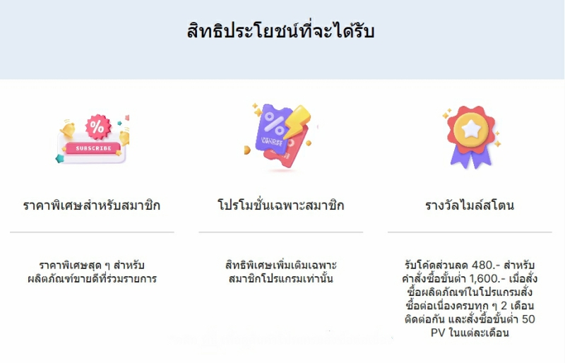โปรแกรมสั่งซื้อต่อเนื่อง (Subsciption Program) มอบส่วนลดพิเศษให้แก่สมาชิกเป็นประจำ โดยปกติจะลด 10% สำหรับสินค้าขายดี และจัดส่งฟรีเมื่อสั่งซื้อเกิน 1,600 บาท เมื่อรักษาระดับการสมัครสมาชิกรายเดือนอย่างน้อย 50 PV ผู้ใช้จะได้รับ "รางวัลพิเศษ" ซึ่งเริ่มตั้งแต่ปี 2026 เป็นต้นไปจะรวมถึง...รับบัตรกำนัลมูลค่า 480 บาททุกๆ 2 เดือนติดต่อกัน พร้อมของขวัญพิเศษเพิ่มเติมเมื่อครบ 6 และ 12 เดือน.